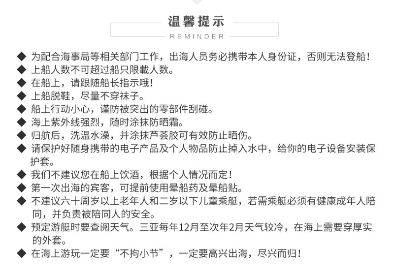 | 保險說明: | 隨游艇險,游艇自帶乘客險。 | ||||||